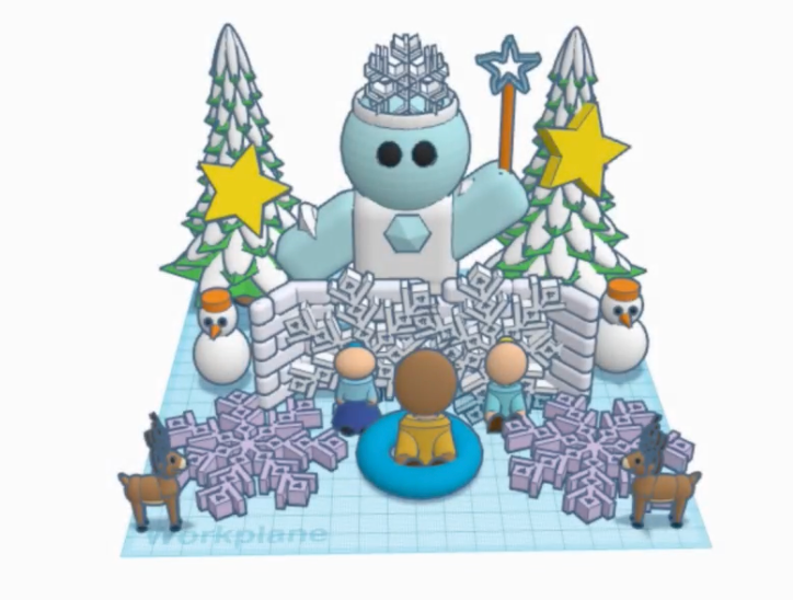 Click on the video and then you can see my screen recording of my project. I created this snowy village through the TinkerCAD app. I was inspired to create this when my friends and I went to Schellville with our families. I loved the snow tubing, so I included kids snow tubing like we did. There’s also a snowball wall, like at Schellville. I included a giant statue of a snow queen because I felt like a snow queen at Schellville. I love Schellville and I hope you love my village!