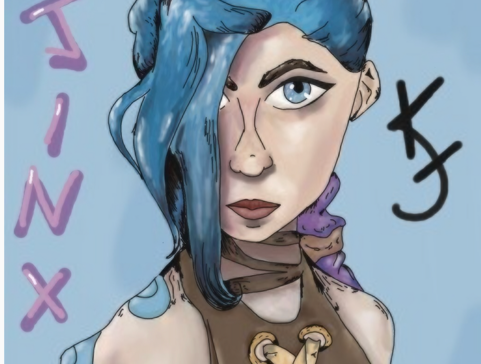 I have entered an original graphic drawing of the character Jinx from the Netflix show Arcane. The style and look of the Jinx character are really appealing to me, and I believed I could recreate the style very well. In order to create the project, I first sketched Jinx on paper while using the reference from the artist account SyrowArt on DeviantArt. Next, I scanned my sketch into the digital design application called Krita. Using Krita, I was able to add a black outline and color to the sketch. The final product is an original digital rendering of the character Jinx from my perspective.